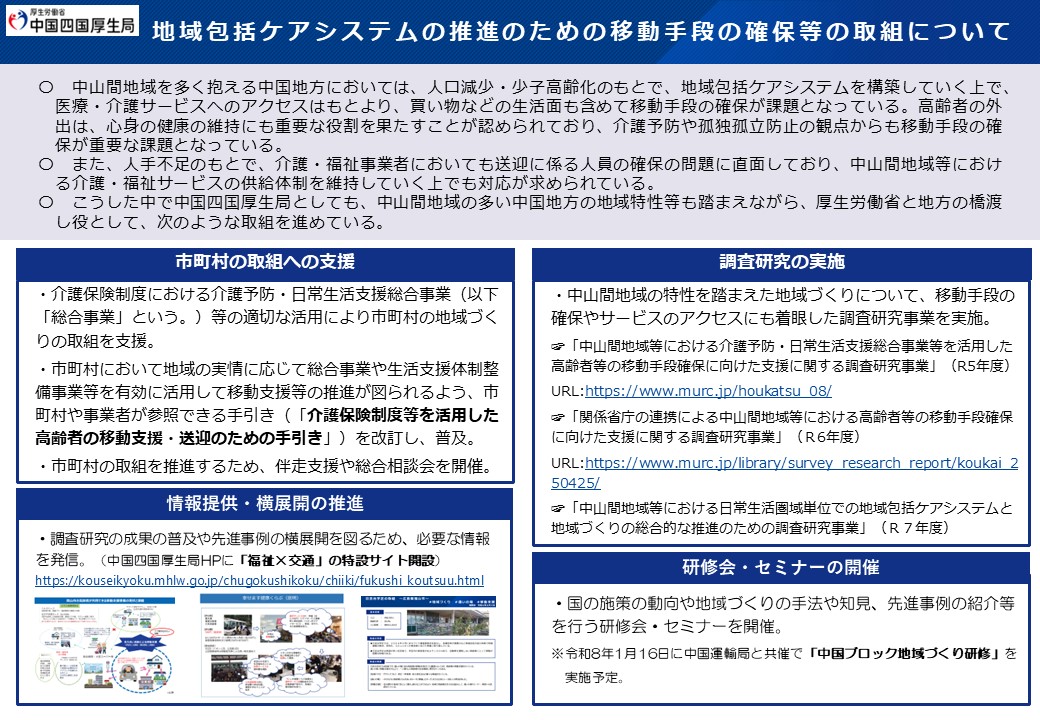- こうした状況のもと、中国四国厚生局と中国運輸局においては、それぞれが有する知見やネットワークを活かし、福祉分野と交通分野における取組の一層の連携の強化を図ることによって、中国地方における関連施策の推進を図ってまいります。