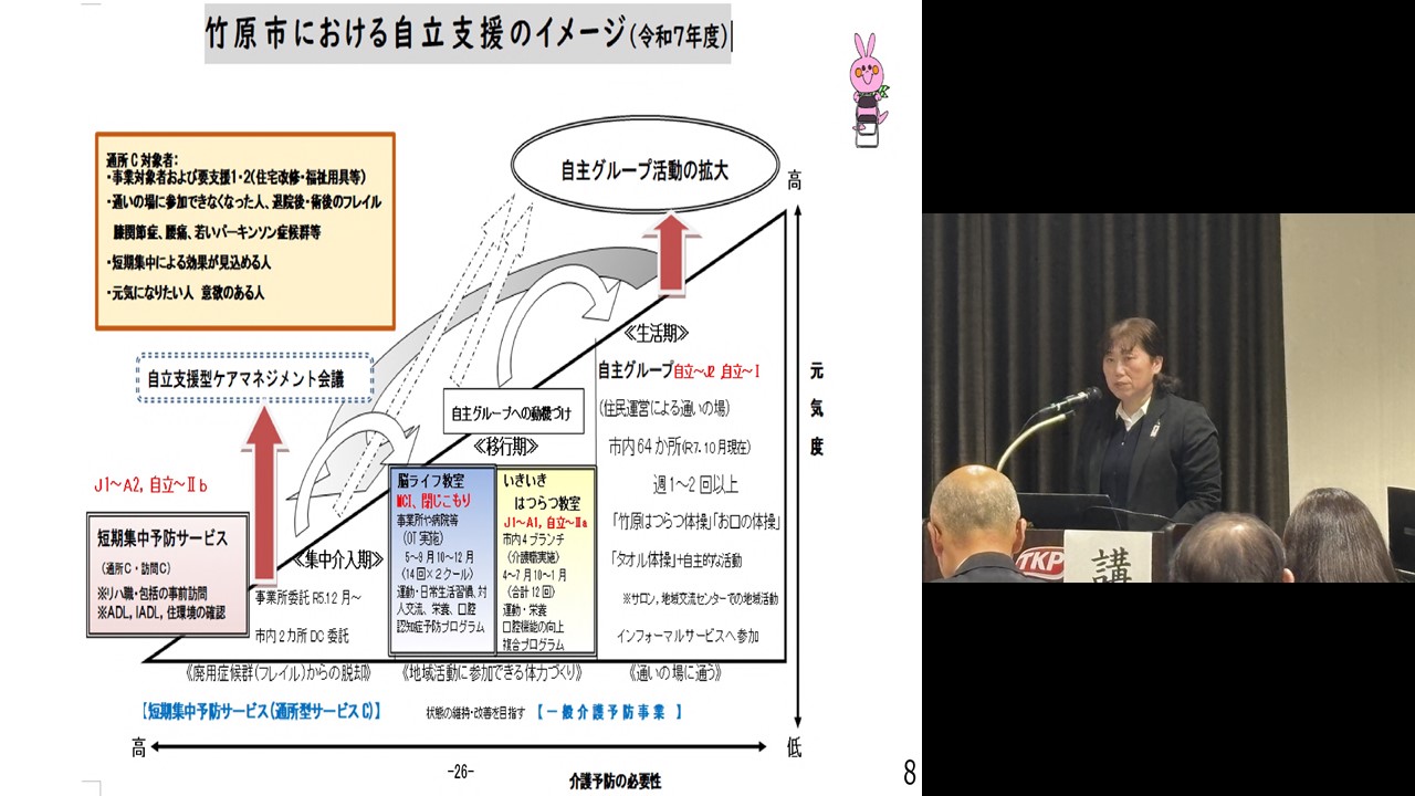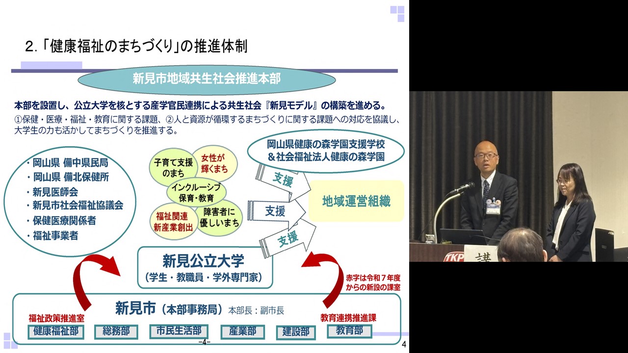 | 15:00~15:50 | 【 パネルディスカッション 】 < パネリスト > ・岡山県新見市 新見市健康福祉部福祉課福祉政策推進室長 樫本 裕 氏 新見市健康福祉部高齢者支援課地域包括支援センター主幹 安達 彩永 氏 ・広島県竹原市 竹原市市民福祉部地域支えあい推進課高齢者支援係保健師 伊藤 泰加 氏 竹原市市民福祉部地域支えあい推進課地域共生社会推進アドバイザー 高原 伸幸 氏 ・検討委員会委員/社会福祉法人尾道さつき会理事長 平石 朗 氏 当日資料[1.7MB] ![]() ・検討委員会委員/自治医科大学地域医療学センター地域医療支援部門教授/岐阜県:県北西部地域医療センター長 後藤 忠雄 氏 当日資料[2.3MB] ![]() < コーディネーター > ・検討委員会委員長/浜松医科大学健康社会医学講座教授 尾島 俊之 氏 < オブザーバー > 中国四国厚生局長 依田 泰 ![]() |