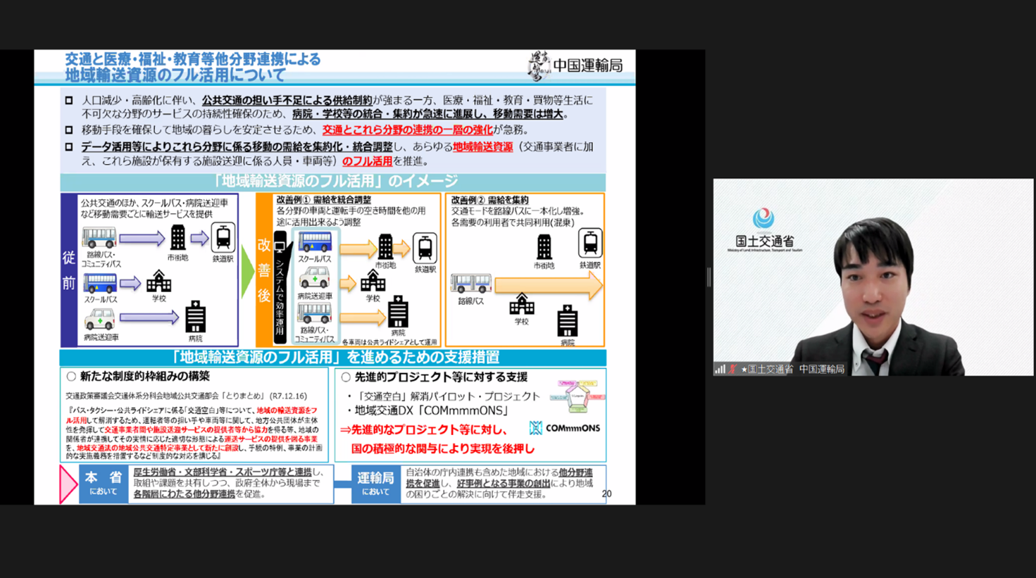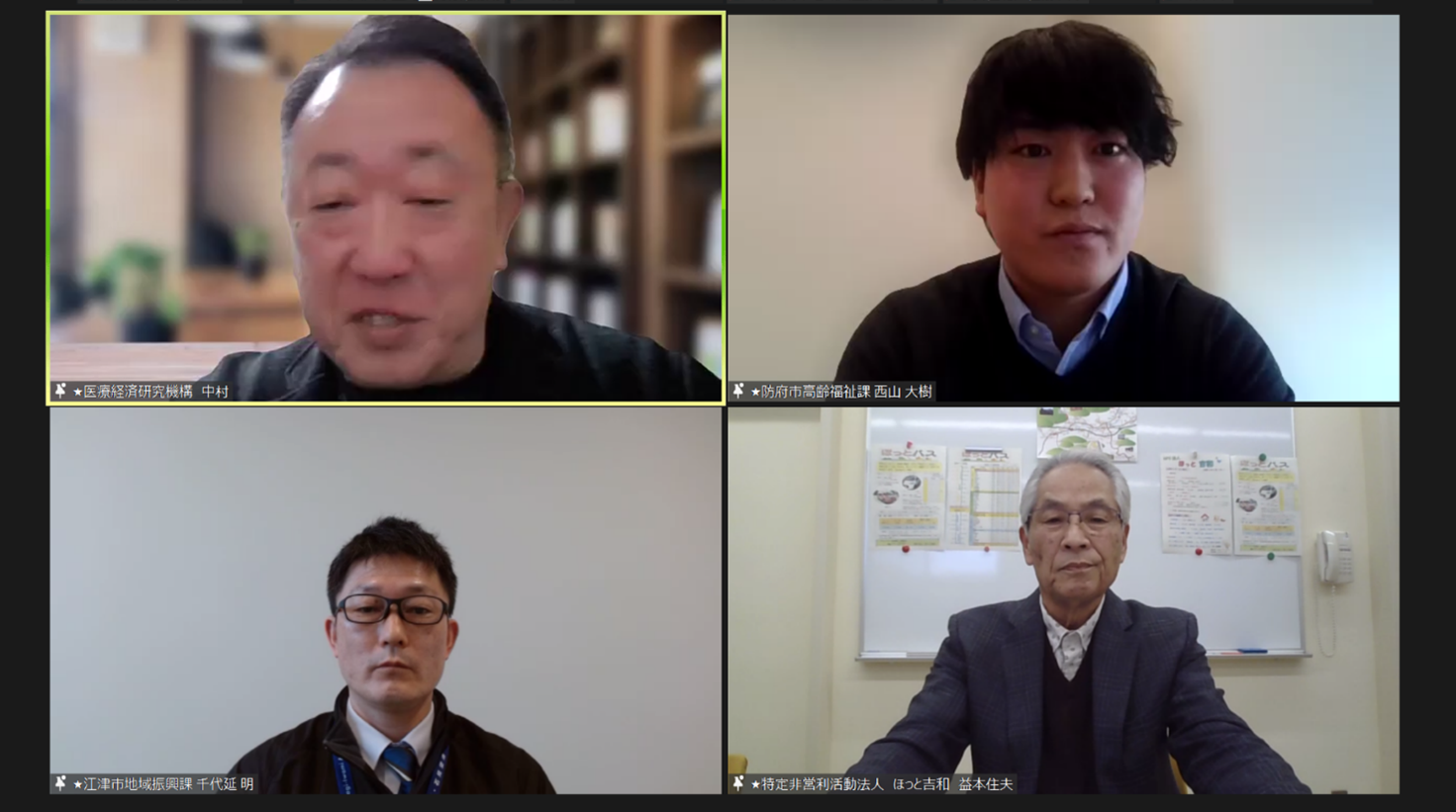 令和8年1月16日、中国運輸局との共催で、「2040年を見据えた多様な主体の参画と連携による地域づくり」をテーマに「令和7年度 中国ブロック地域づくり研修」(オンライン)を開催しました。中国5県の県・市町村担当者のみならず、全国の地域づくりに携わる様々な職種の方に多数ご参加いただきました。本研修会では、厚生労働省老健局や中国運輸局による行政説明を行ったほか、 医療経済研究機構 政策推進部 副部長 中村 一朗 様より、「多様な主体の参画・連携による地域づくりのポイント ~2040年を見据えた地域デザイン~」と題して基調講演をいただくとともに、山口県防府市、広島県廿日市市の特定非営利活動法人「ほっと吉和」及び島根県江津市のご担当者様から、各々の取組事例を紹介していただきました。また、中村様と事例発表者の皆様でトークセッションを行い、それぞれの取組や地域づくりに関する議論を深めました。
