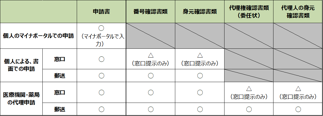 「個人による書面での申請」又は「医療機関・薬局の代理申請」の場合は追加で必要な書類がありますので、ご注意ください。
