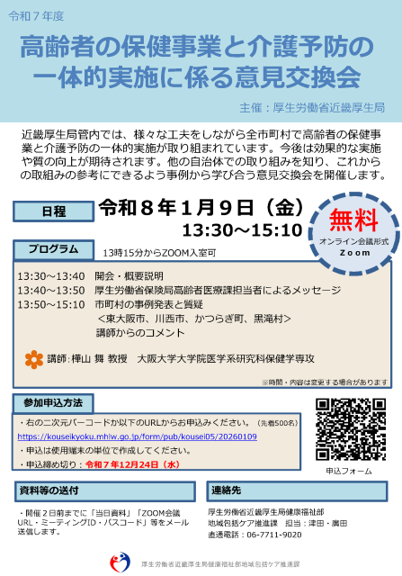 近畿厚生局管内では、全市町村が、様々な工夫をしながら 高齢者が健康で長く自立して暮らせるように、健康づくりや介護予防を連動させて切れ目なく支援を行う「一体的実施」に取り組んでいます。大阪大学大学院医学系研究科保健学専攻 樺山教授を講師として、約280名の市町村・府県・後期高齢者医療広域連合・国民健康保険団体連合会の担当者が他の自治体の取組を知り、これからの取組の参考にできるように事例を学び合いました。