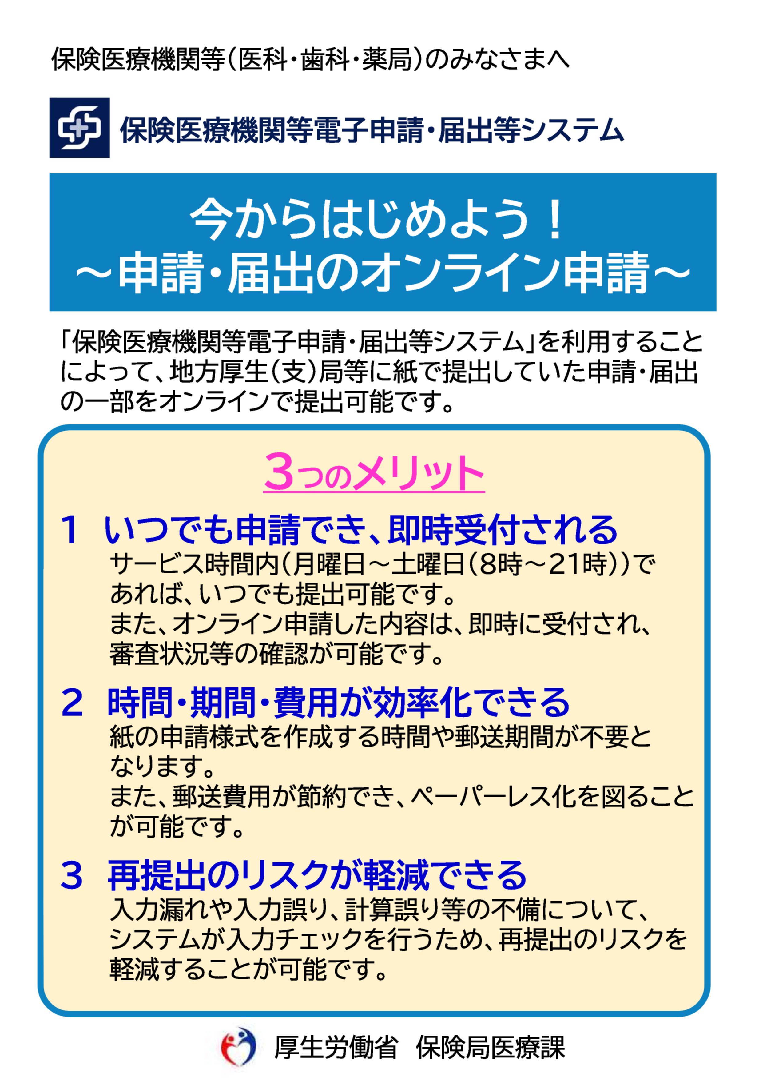 - 保険医療機関等の申請・届出の一部がオンラインで申請・届出することが可能です。(保険医療機関等電子申請・届出等システム)